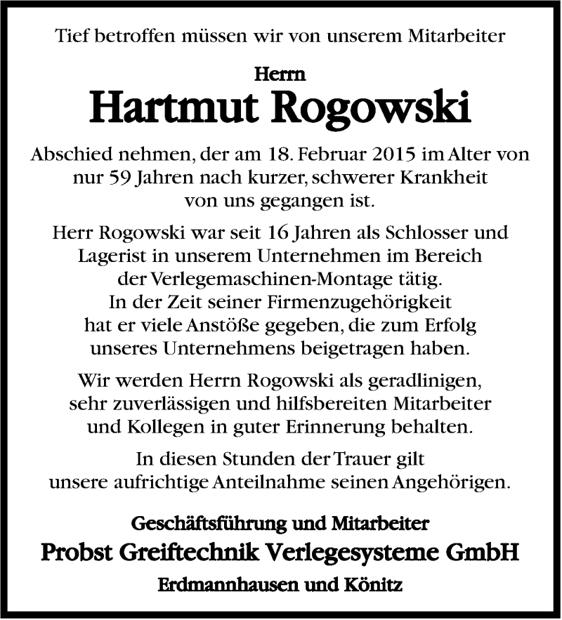 Hier finden Sie alle Traueranzeigen aus der Zeitung, die bisher für Hartmut Rogowski erschienen sind. Weitere Traueranzeigen, die in der Zeitung erscheinen, werden hier ebenfalls aufgelistet