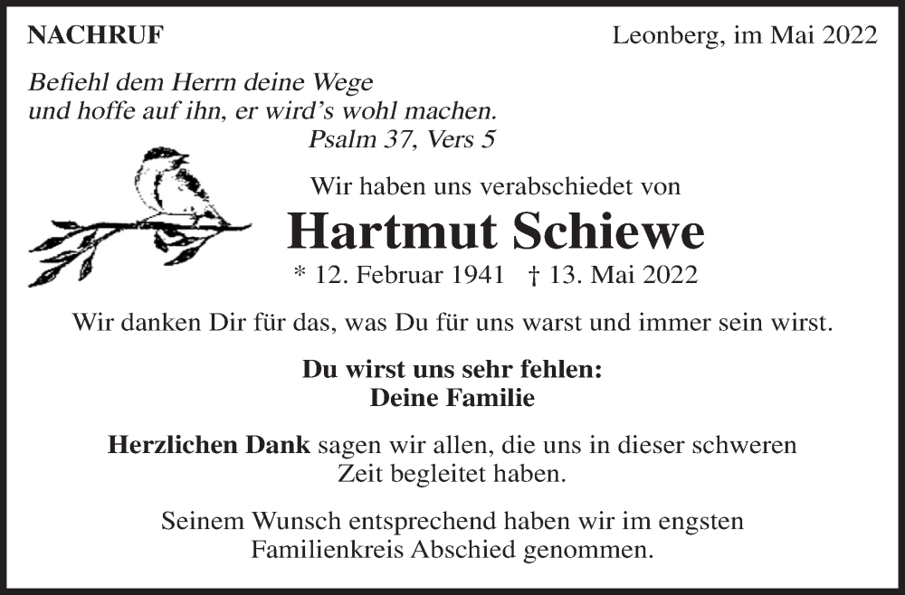 Hier finden Sie alle Traueranzeigen aus der Zeitung, die bisher für Hartmut Schiewe erschienen sind. Weitere Traueranzeigen, die in der Zeitung erscheinen, werden hier ebenfalls aufgelistet