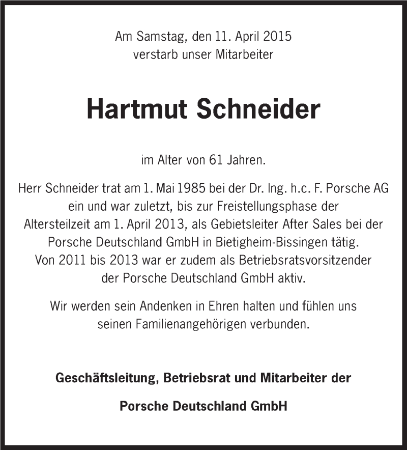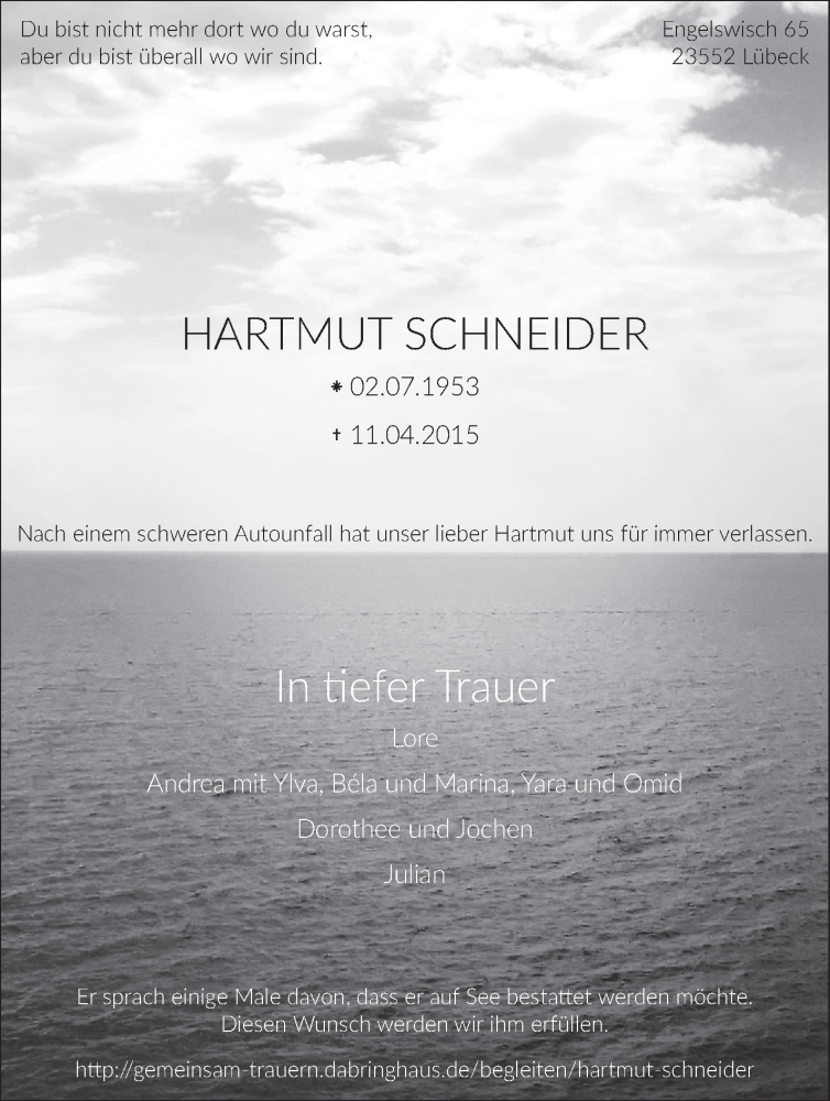Hier finden Sie alle Traueranzeigen aus der Zeitung, die bisher für Hartmut Schneider erschienen sind. Weitere Traueranzeigen, die in der Zeitung erscheinen, werden hier ebenfalls aufgelistet
