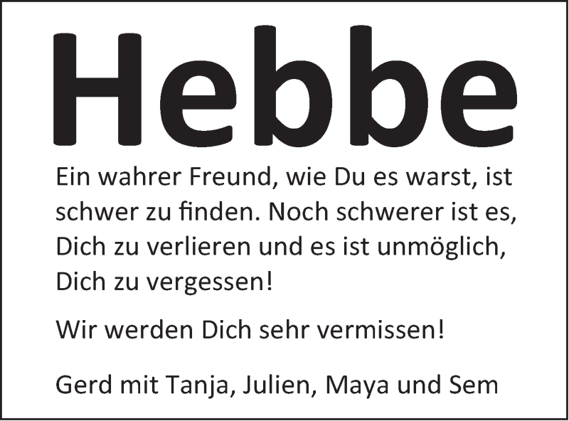 Hier finden Sie alle Traueranzeigen aus der Zeitung, die bisher für Hebbe erschienen sind. Weitere Traueranzeigen, die in der Zeitung erscheinen, werden hier ebenfalls aufgelistet