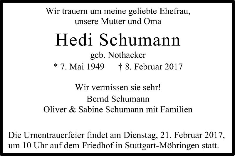 Hier finden Sie alle Traueranzeigen aus der Zeitung, die bisher für Hedi Schumann erschienen sind. Weitere Traueranzeigen, die in der Zeitung erscheinen, werden hier ebenfalls aufgelistet