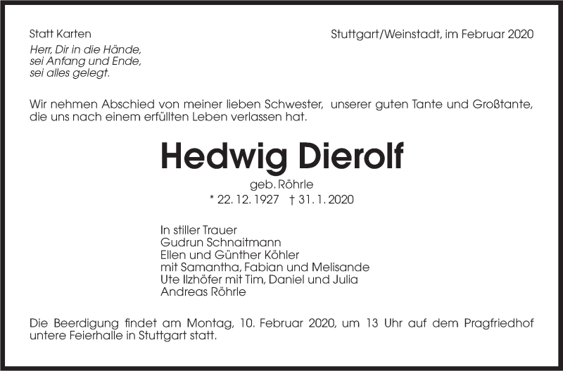 Hier finden Sie alle Traueranzeigen aus der Zeitung, die bisher für Hedwig Dierolf erschienen sind. Weitere Traueranzeigen, die in der Zeitung erscheinen, werden hier ebenfalls aufgelistet