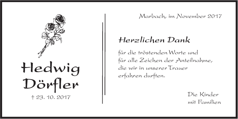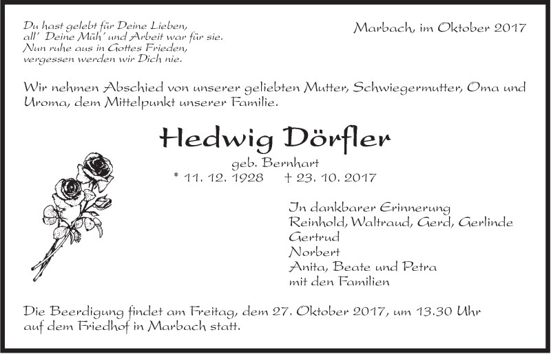 Hier finden Sie alle Traueranzeigen aus der Zeitung, die bisher für Hedwig Dörfler erschienen sind. Weitere Traueranzeigen, die in der Zeitung erscheinen, werden hier ebenfalls aufgelistet