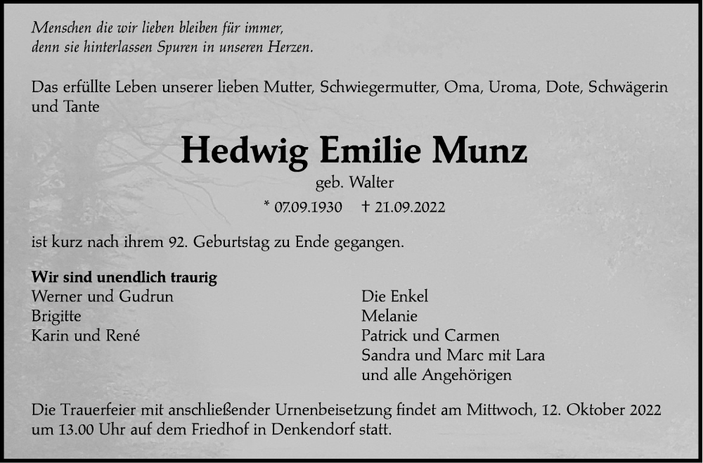 Hier finden Sie alle Traueranzeigen aus der Zeitung, die bisher für Hedwig Emilie Munz erschienen sind. Weitere Traueranzeigen, die in der Zeitung erscheinen, werden hier ebenfalls aufgelistet