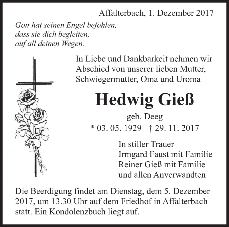 Hier finden Sie alle Traueranzeigen aus der Zeitung, die bisher für Hedwig Gieß erschienen sind. Weitere Traueranzeigen, die in der Zeitung erscheinen, werden hier ebenfalls aufgelistet