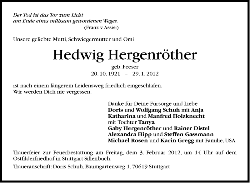 Hier finden Sie alle Traueranzeigen aus der Zeitung, die bisher für Hedwig Hergenröther erschienen sind. Weitere Traueranzeigen, die in der Zeitung erscheinen, werden hier ebenfalls aufgelistet