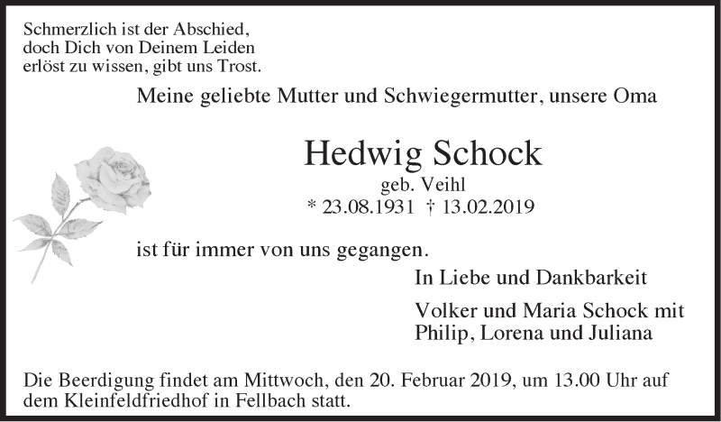Hier finden Sie alle Traueranzeigen aus der Zeitung, die bisher für Hedwig Schock erschienen sind. Weitere Traueranzeigen, die in der Zeitung erscheinen, werden hier ebenfalls aufgelistet