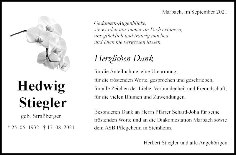 Hier finden Sie alle Traueranzeigen aus der Zeitung, die bisher für Hedwig Stiegler erschienen sind. Weitere Traueranzeigen, die in der Zeitung erscheinen, werden hier ebenfalls aufgelistet