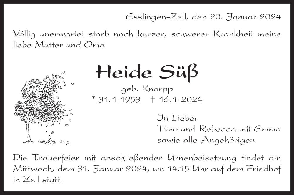 Hier finden Sie alle Traueranzeigen aus der Zeitung, die bisher für Heide Süß erschienen sind. Weitere Traueranzeigen, die in der Zeitung erscheinen, werden hier ebenfalls aufgelistet