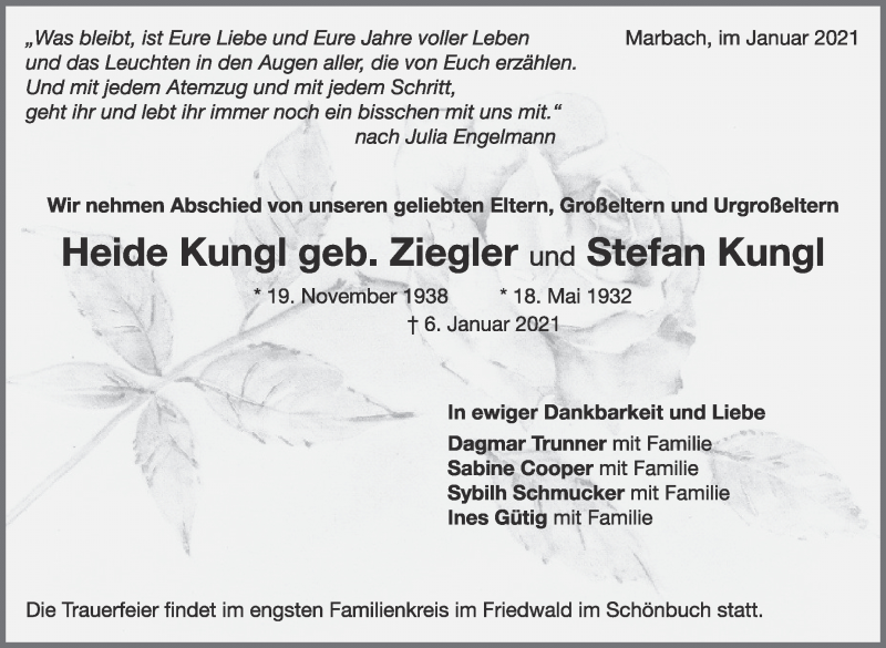 Hier finden Sie alle Traueranzeigen aus der Zeitung, die bisher für Heide und Stefan Kungl erschienen sind. Weitere Traueranzeigen, die in der Zeitung erscheinen, werden hier ebenfalls aufgelistet