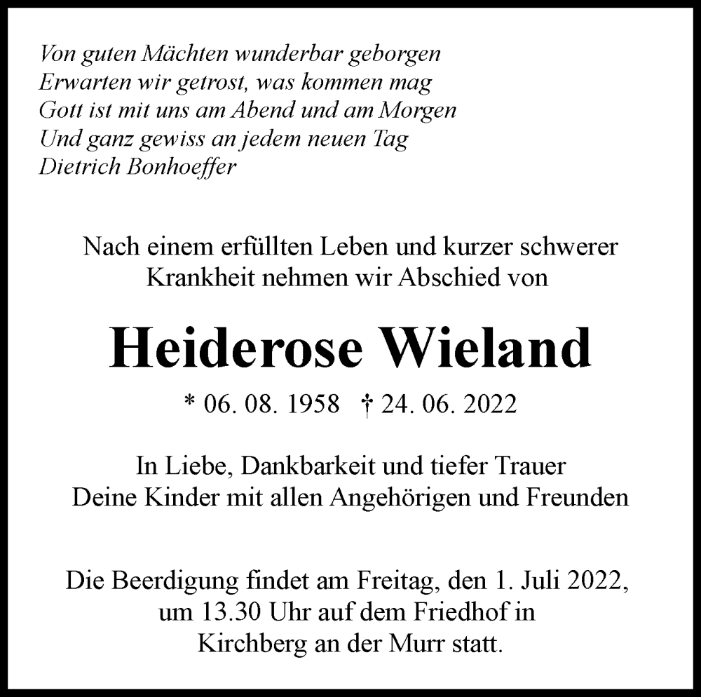 Hier finden Sie alle Traueranzeigen aus der Zeitung, die bisher für Heiderose Wieland erschienen sind. Weitere Traueranzeigen, die in der Zeitung erscheinen, werden hier ebenfalls aufgelistet