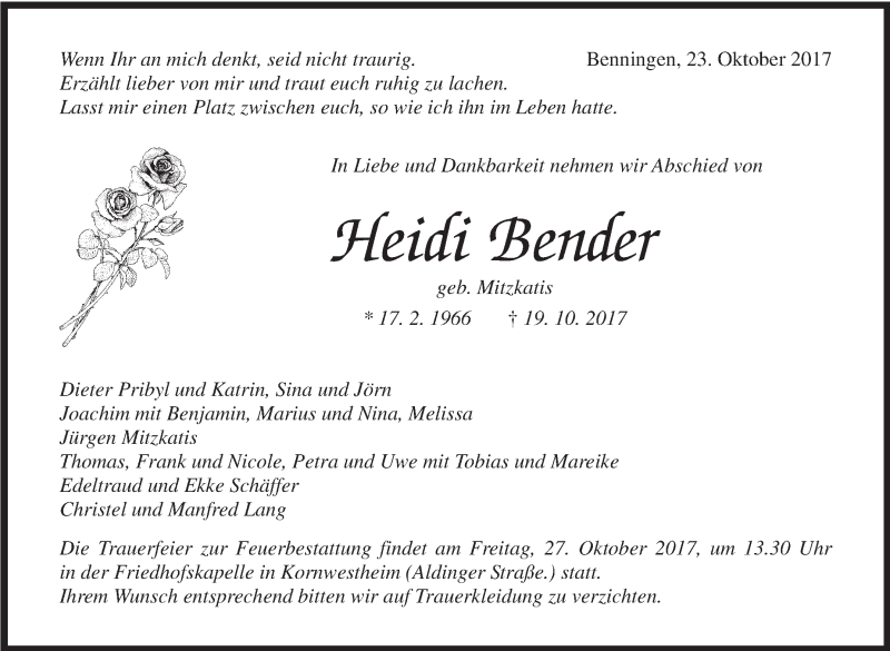 Hier finden Sie alle Traueranzeigen aus der Zeitung, die bisher für Heidi Bender erschienen sind. Weitere Traueranzeigen, die in der Zeitung erscheinen, werden hier ebenfalls aufgelistet