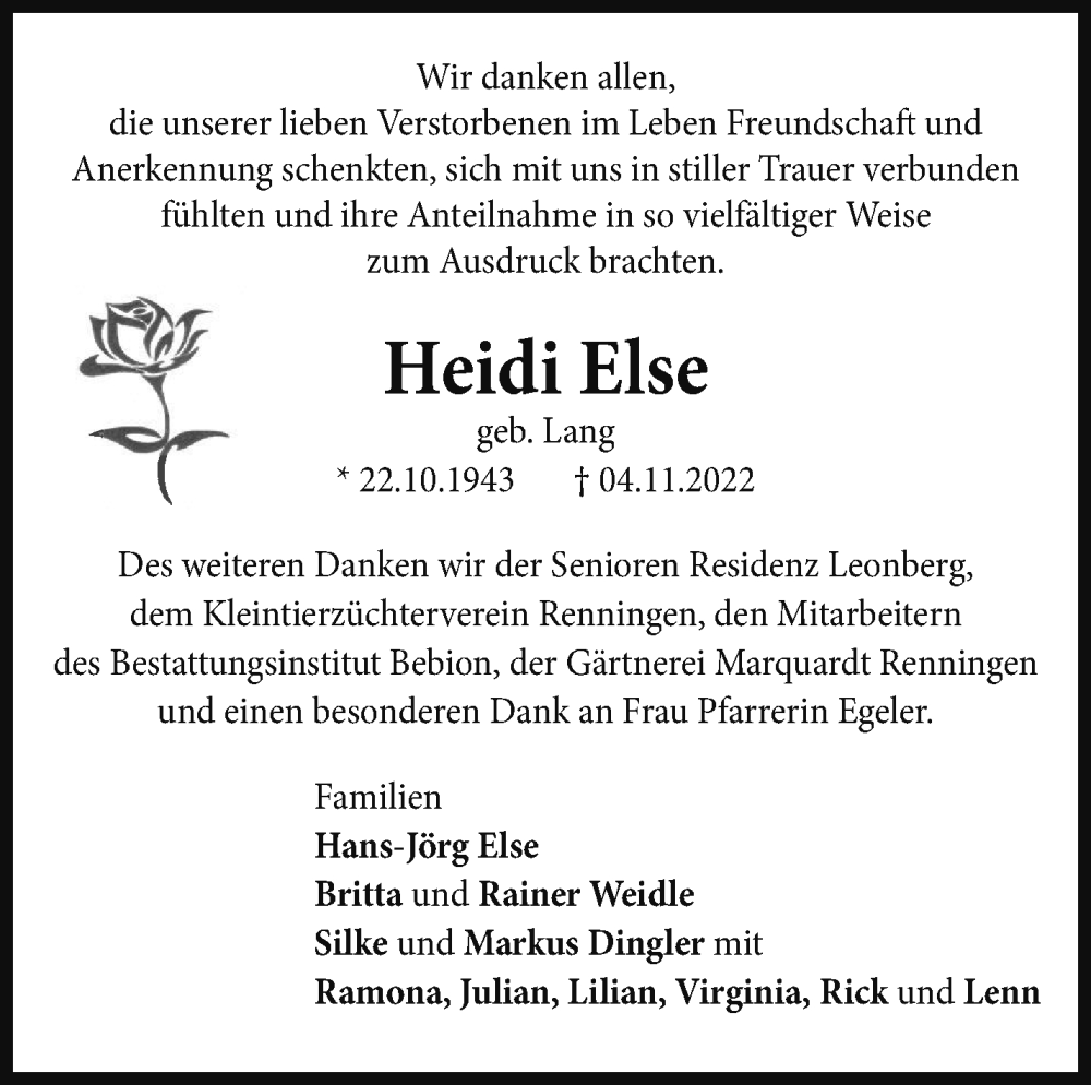 Hier finden Sie alle Traueranzeigen aus der Zeitung, die bisher für Heidi Else erschienen sind. Weitere Traueranzeigen, die in der Zeitung erscheinen, werden hier ebenfalls aufgelistet