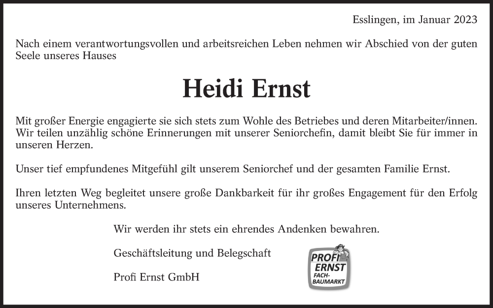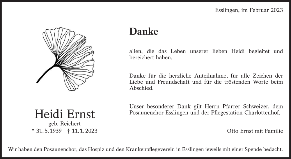 Hier finden Sie alle Traueranzeigen aus der Zeitung, die bisher für Heidi Ernst erschienen sind. Weitere Traueranzeigen, die in der Zeitung erscheinen, werden hier ebenfalls aufgelistet
