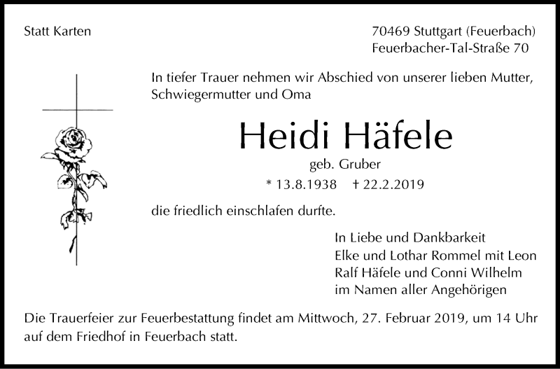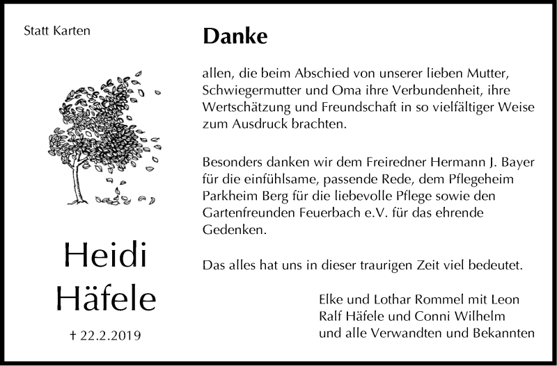 Hier finden Sie alle Traueranzeigen aus der Zeitung, die bisher für Heidi Häfele erschienen sind. Weitere Traueranzeigen, die in der Zeitung erscheinen, werden hier ebenfalls aufgelistet
