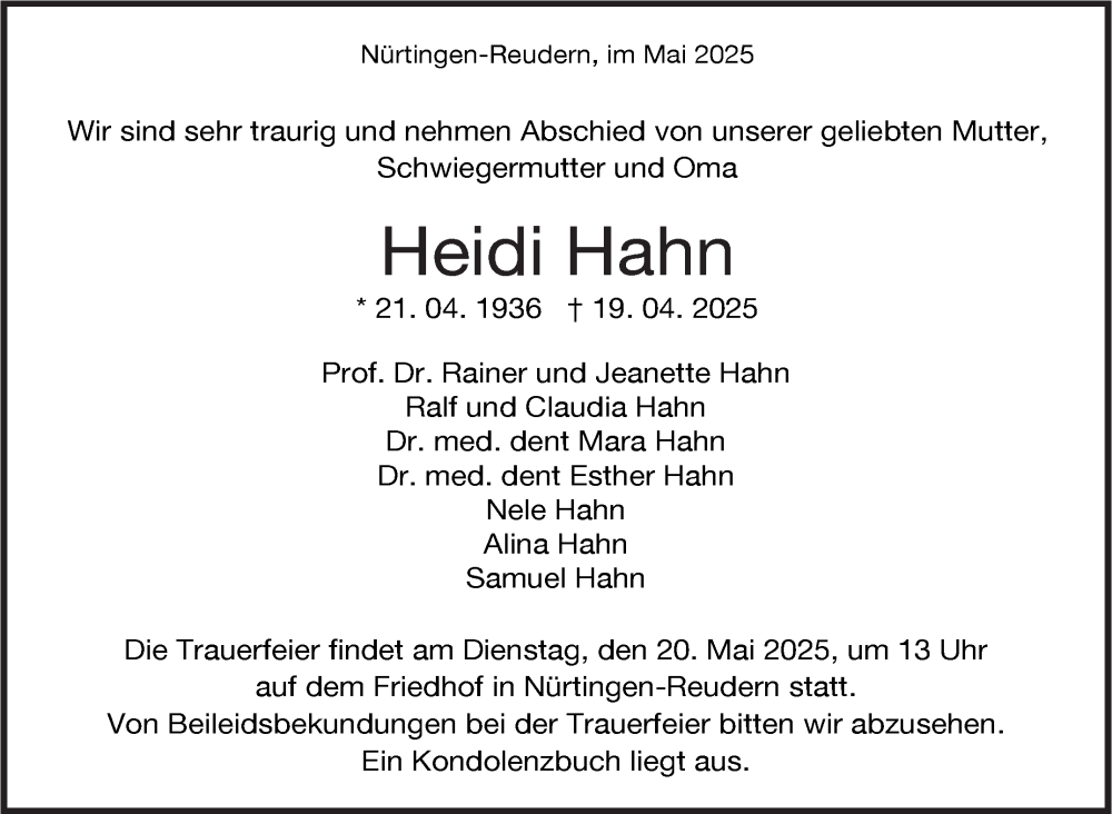 Hier finden Sie alle Traueranzeigen aus der Zeitung, die bisher für Heidi Hahn erschienen sind. Weitere Traueranzeigen, die in der Zeitung erscheinen, werden hier ebenfalls aufgelistet