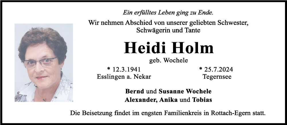 Hier finden Sie alle Traueranzeigen aus der Zeitung, die bisher für Heidi Holm erschienen sind. Weitere Traueranzeigen, die in der Zeitung erscheinen, werden hier ebenfalls aufgelistet