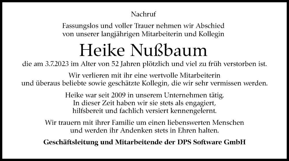 Hier finden Sie alle Traueranzeigen aus der Zeitung, die bisher für Heike Nußbaum erschienen sind. Weitere Traueranzeigen, die in der Zeitung erscheinen, werden hier ebenfalls aufgelistet