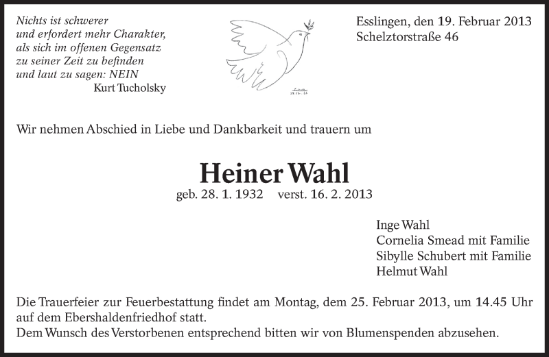 Hier finden Sie alle Traueranzeigen aus der Zeitung, die bisher für Heiner Wahl erschienen sind. Weitere Traueranzeigen, die in der Zeitung erscheinen, werden hier ebenfalls aufgelistet