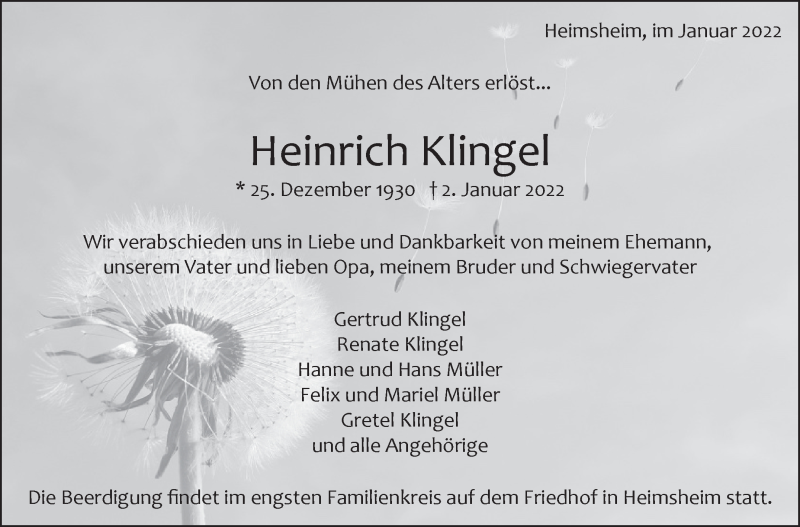Hier finden Sie alle Traueranzeigen aus der Zeitung, die bisher für Heinrich Klingel erschienen sind. Weitere Traueranzeigen, die in der Zeitung erscheinen, werden hier ebenfalls aufgelistet