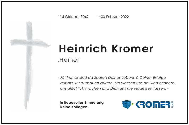 Hier finden Sie alle Traueranzeigen aus der Zeitung, die bisher für Heinrich Kromer erschienen sind. Weitere Traueranzeigen, die in der Zeitung erscheinen, werden hier ebenfalls aufgelistet