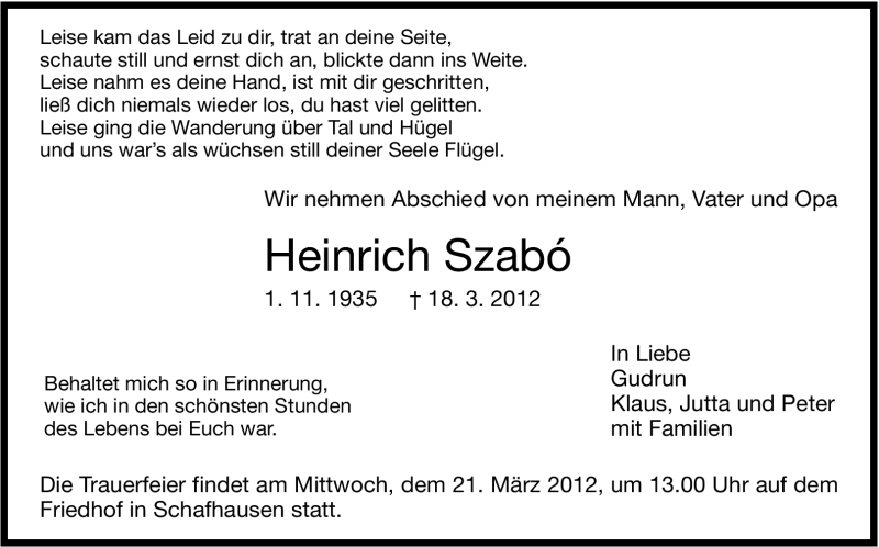 Hier finden Sie alle Traueranzeigen aus der Zeitung, die bisher für Heinrich Szabó erschienen sind. Weitere Traueranzeigen, die in der Zeitung erscheinen, werden hier ebenfalls aufgelistet