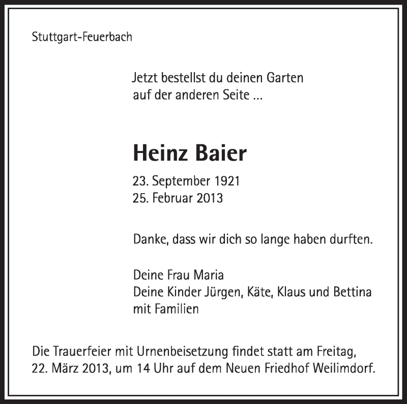 Hier finden Sie alle Traueranzeigen aus der Zeitung, die bisher für Heinz Baier erschienen sind. Weitere Traueranzeigen, die in der Zeitung erscheinen, werden hier ebenfalls aufgelistet