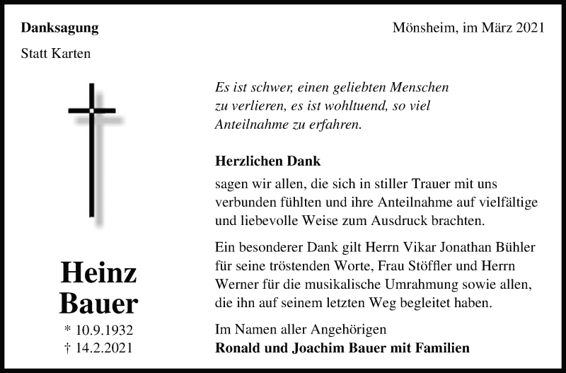 Hier finden Sie alle Traueranzeigen aus der Zeitung, die bisher für Heinz Bauer erschienen sind. Weitere Traueranzeigen, die in der Zeitung erscheinen, werden hier ebenfalls aufgelistet