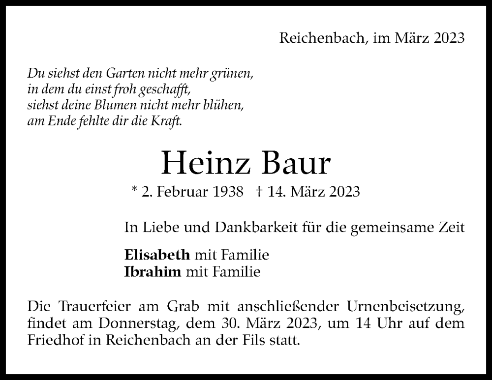 Hier finden Sie alle Traueranzeigen aus der Zeitung, die bisher für Heinz Baur erschienen sind. Weitere Traueranzeigen, die in der Zeitung erscheinen, werden hier ebenfalls aufgelistet