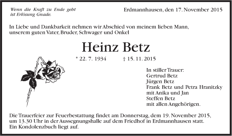 Hier finden Sie alle Traueranzeigen aus der Zeitung, die bisher für Heinz Betz erschienen sind. Weitere Traueranzeigen, die in der Zeitung erscheinen, werden hier ebenfalls aufgelistet