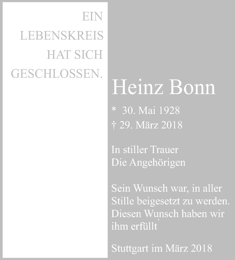 Hier finden Sie alle Traueranzeigen aus der Zeitung, die bisher für Heinz Bonn erschienen sind. Weitere Traueranzeigen, die in der Zeitung erscheinen, werden hier ebenfalls aufgelistet