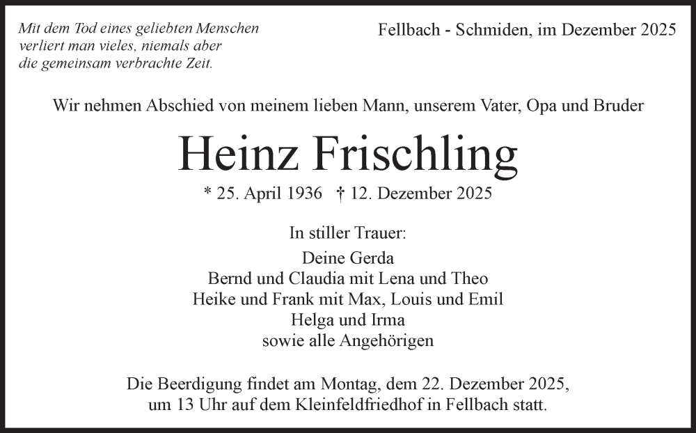 Hier finden Sie alle Traueranzeigen aus der Zeitung, die bisher für Heinz Frischling erschienen sind. Weitere Traueranzeigen, die in der Zeitung erscheinen, werden hier ebenfalls aufgelistet