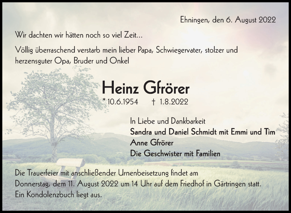 Hier finden Sie alle Traueranzeigen aus der Zeitung, die bisher für Heinz Gfrörer erschienen sind. Weitere Traueranzeigen, die in der Zeitung erscheinen, werden hier ebenfalls aufgelistet