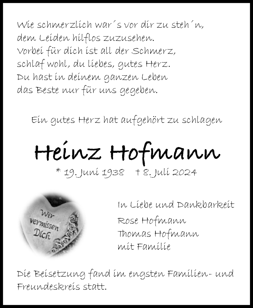 Hier finden Sie alle Traueranzeigen aus der Zeitung, die bisher für Heinz Hofmann erschienen sind. Weitere Traueranzeigen, die in der Zeitung erscheinen, werden hier ebenfalls aufgelistet