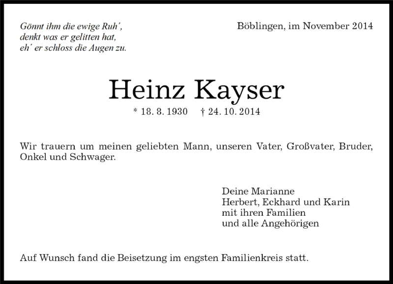 Hier finden Sie alle Traueranzeigen aus der Zeitung, die bisher für Heinz Kayser erschienen sind. Weitere Traueranzeigen, die in der Zeitung erscheinen, werden hier ebenfalls aufgelistet