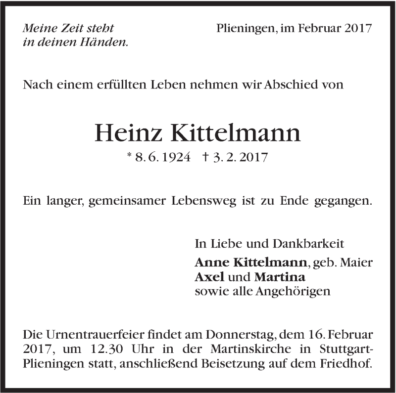 Hier finden Sie alle Traueranzeigen aus der Zeitung, die bisher für Heinz Kittelmann erschienen sind. Weitere Traueranzeigen, die in der Zeitung erscheinen, werden hier ebenfalls aufgelistet