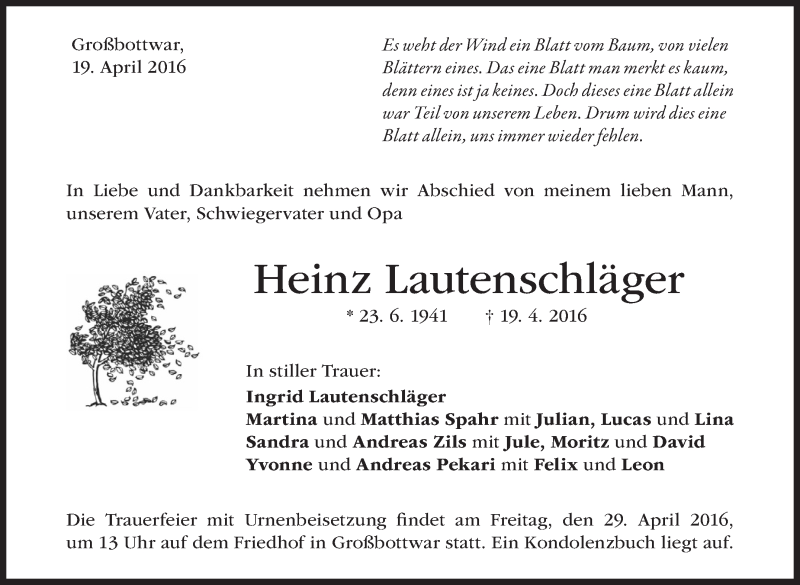 Hier finden Sie alle Traueranzeigen aus der Zeitung, die bisher für Heinz Lautenschläger erschienen sind. Weitere Traueranzeigen, die in der Zeitung erscheinen, werden hier ebenfalls aufgelistet