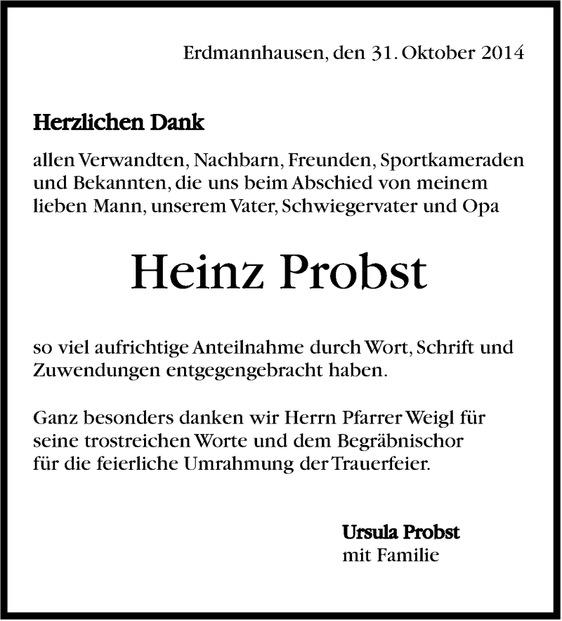 Hier finden Sie alle Traueranzeigen aus der Zeitung, die bisher für Heinz Probst erschienen sind. Weitere Traueranzeigen, die in der Zeitung erscheinen, werden hier ebenfalls aufgelistet