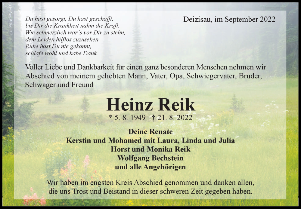Hier finden Sie alle Traueranzeigen aus der Zeitung, die bisher für Heinz Reik erschienen sind. Weitere Traueranzeigen, die in der Zeitung erscheinen, werden hier ebenfalls aufgelistet