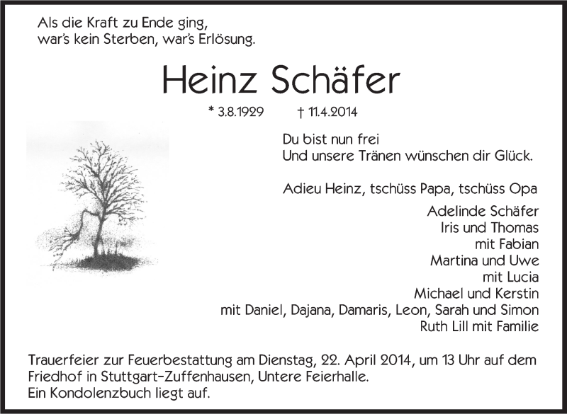 Hier finden Sie alle Traueranzeigen aus der Zeitung, die bisher für Heinz Schäfer erschienen sind. Weitere Traueranzeigen, die in der Zeitung erscheinen, werden hier ebenfalls aufgelistet