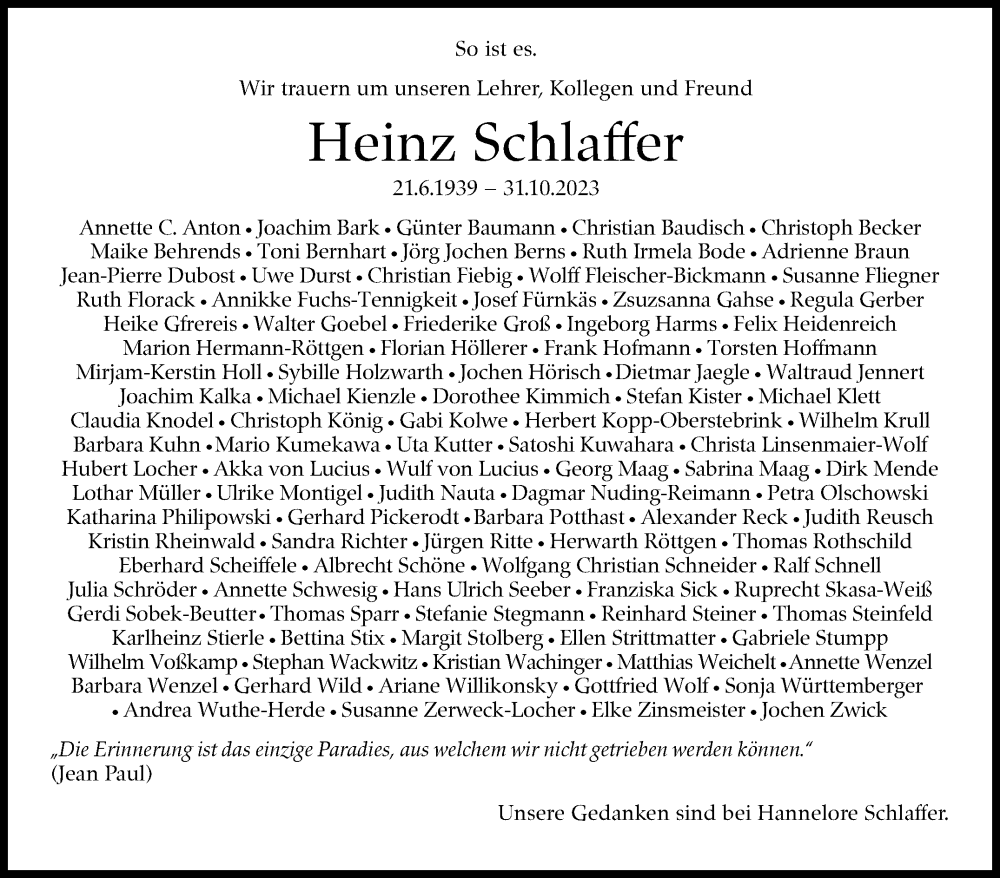 Hier finden Sie alle Traueranzeigen aus der Zeitung, die bisher für Heinz Schlaffer erschienen sind. Weitere Traueranzeigen, die in der Zeitung erscheinen, werden hier ebenfalls aufgelistet