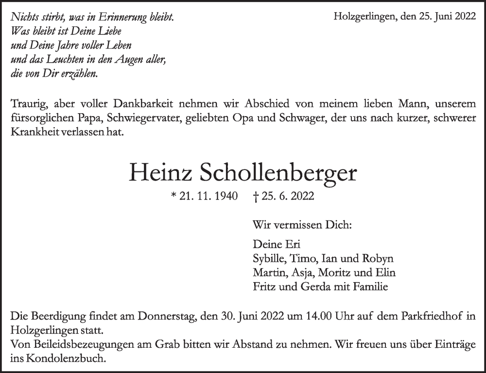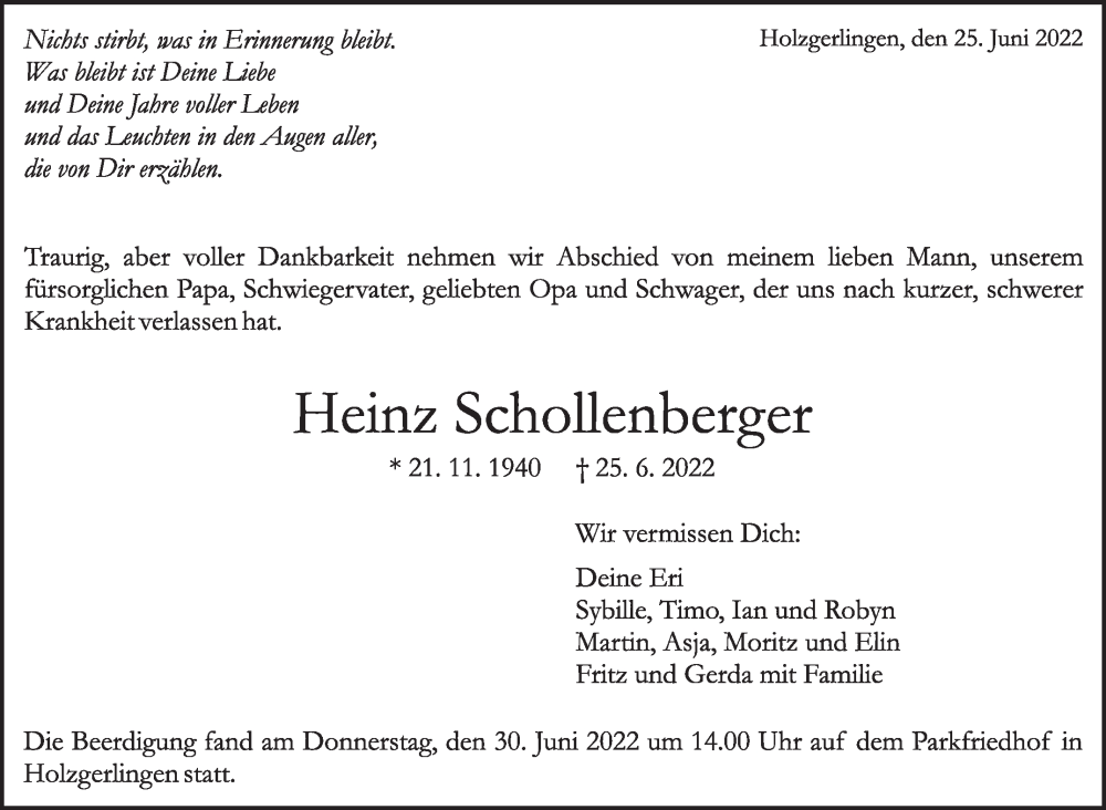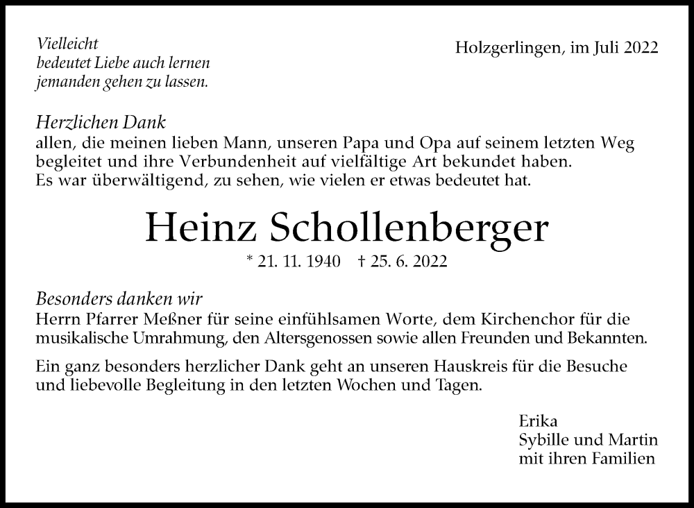 Hier finden Sie alle Traueranzeigen aus der Zeitung, die bisher für Heinz Schollenberger erschienen sind. Weitere Traueranzeigen, die in der Zeitung erscheinen, werden hier ebenfalls aufgelistet