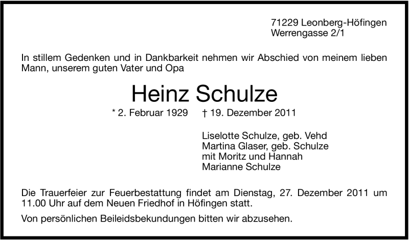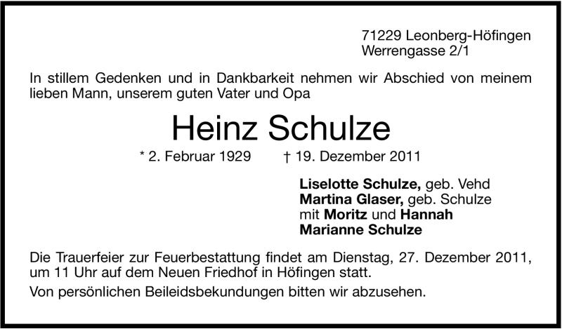 Hier finden Sie alle Traueranzeigen aus der Zeitung, die bisher für Heinz Schulze erschienen sind. Weitere Traueranzeigen, die in der Zeitung erscheinen, werden hier ebenfalls aufgelistet
