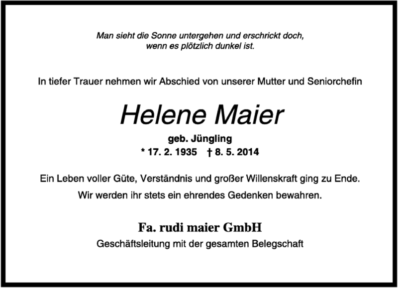 Hier finden Sie alle Traueranzeigen aus der Zeitung, die bisher für Helene Maier erschienen sind. Weitere Traueranzeigen, die in der Zeitung erscheinen, werden hier ebenfalls aufgelistet
