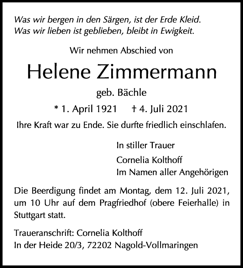 Hier finden Sie alle Traueranzeigen aus der Zeitung, die bisher für Helene Zimmermann erschienen sind. Weitere Traueranzeigen, die in der Zeitung erscheinen, werden hier ebenfalls aufgelistet