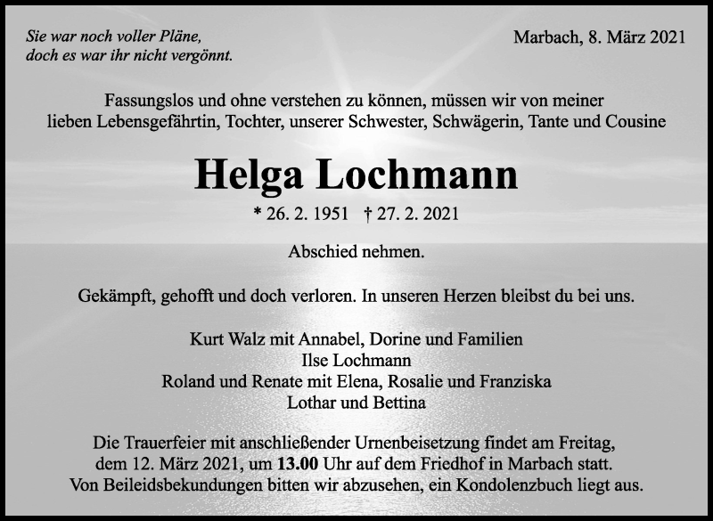 Hier finden Sie alle Traueranzeigen aus der Zeitung, die bisher für Helga Lochmann erschienen sind. Weitere Traueranzeigen, die in der Zeitung erscheinen, werden hier ebenfalls aufgelistet