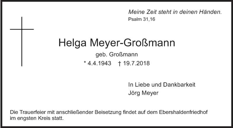 Hier finden Sie alle Traueranzeigen aus der Zeitung, die bisher für Helga Meyer-Großmann erschienen sind. Weitere Traueranzeigen, die in der Zeitung erscheinen, werden hier ebenfalls aufgelistet