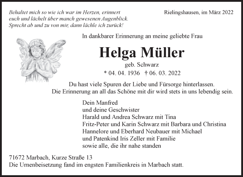 Hier finden Sie alle Traueranzeigen aus der Zeitung, die bisher für Helga Müller erschienen sind. Weitere Traueranzeigen, die in der Zeitung erscheinen, werden hier ebenfalls aufgelistet