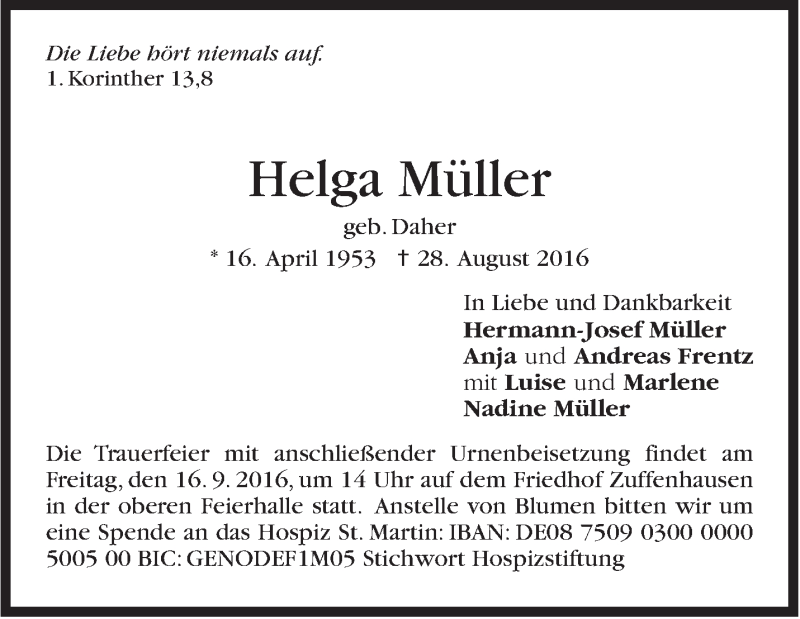 Hier finden Sie alle Traueranzeigen aus der Zeitung, die bisher für Helga Müller erschienen sind. Weitere Traueranzeigen, die in der Zeitung erscheinen, werden hier ebenfalls aufgelistet