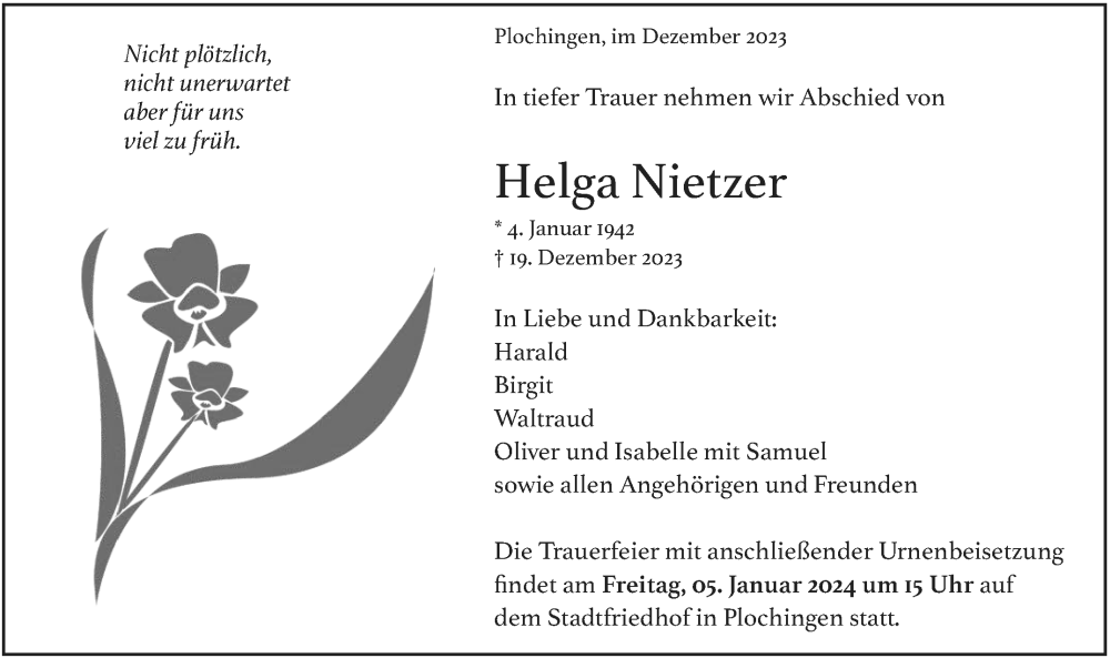 Hier finden Sie alle Traueranzeigen aus der Zeitung, die bisher für Helga Nietzer erschienen sind. Weitere Traueranzeigen, die in der Zeitung erscheinen, werden hier ebenfalls aufgelistet